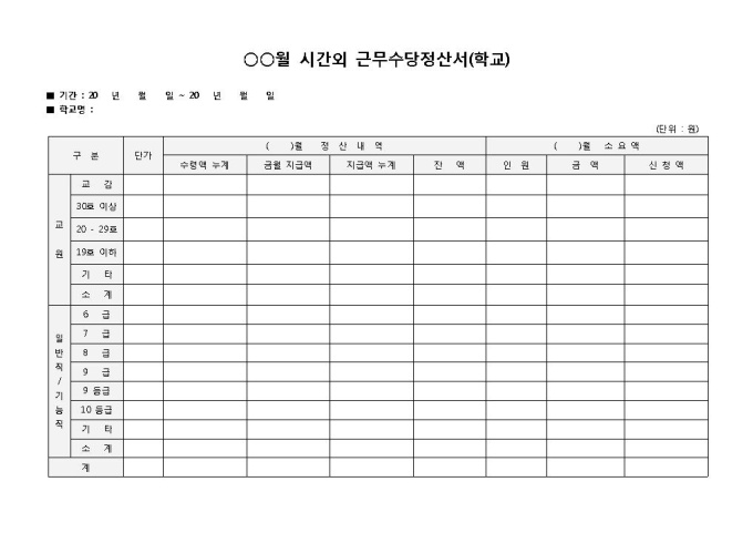 9,000원/월근무외수당정산서입니다. 구분, 단가, 수령액 누계, 금월지급액 등의 항목으로 구성되어 있습니다. 학교에서 월별 시간외 수당 내역 정산시 사용할 수 있는 양식입니다.