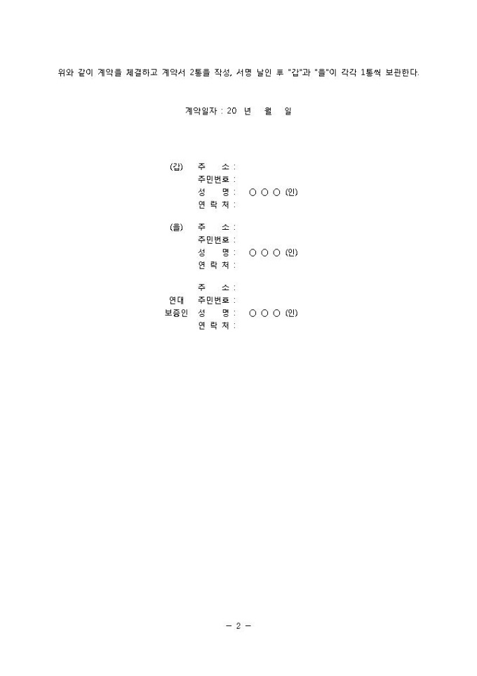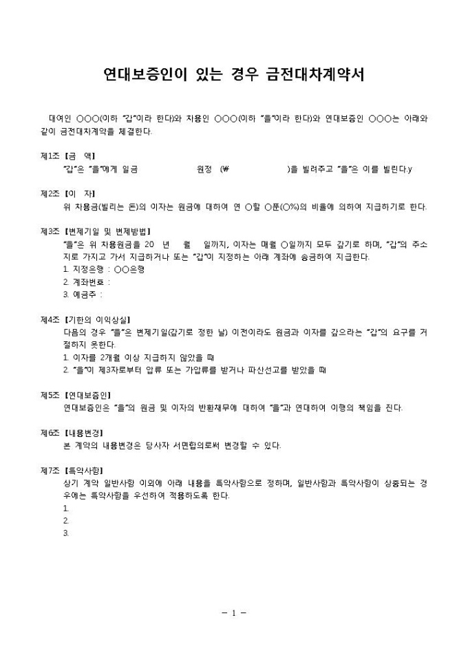 9,000원/월금전대차계약서(연대보증인)입니다. 금액, 이자, 변제기일 및 변제방법, 기한의 이익상실, 연대보증인 등의 항목으로 구성되어 있습니다. 총 7조항으로 구성되어 있고 연대보증인이 있는 금전대차 계약시 간단하게 작성하여 사용할 수 있는 양식입니다.