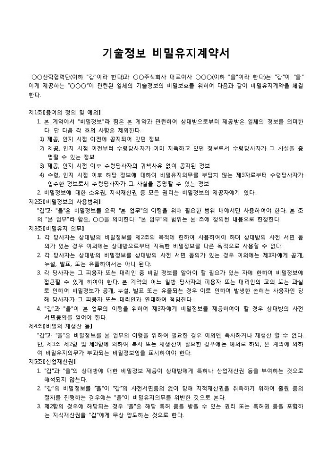 9,000원/월기술정보 비밀유지계약서입니다. 비밀 유지 계약 내용으로 구성되어 있습니다. 산학협력단과 기업 대표이사 상호간에 기술정보의 비밀보호를 위해 비밀 유지 계약서를 작성할 때 사용할 수 있습니다.