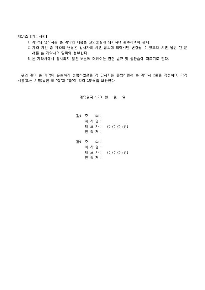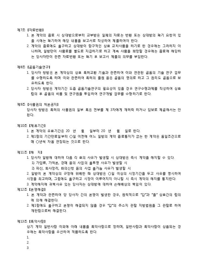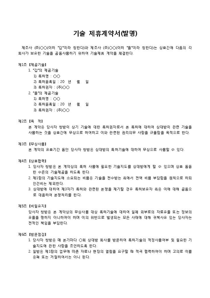 9,000원/월기술제휴계약서(발명)입니다. 제공기술, 목적, 무상사용, 상호협력, 비밀유지, 방문점검 등이 항목으로 구성되어 있습니다. 총 14조항으로 구성되어 있으며 제조사와 제조사 간 각 회사가 보유한 기술을 공동사용하기 위한 제휴 계약 시 사용할 수 있는 양식입니다.