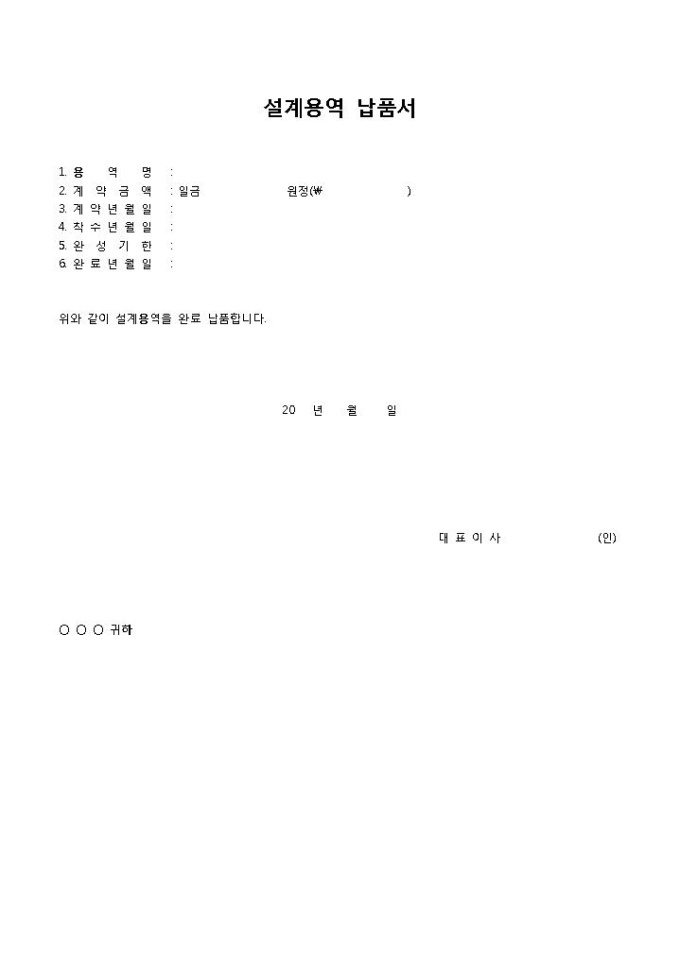 9,000원/월납품서(설계용역)입니다. 용역명, 계약금액, 계약년월일, 착수년월일 등의 항목으로 구성되어 있습니다. 설계용역을 완료 후 납품 시 사용할 수 있는 납품서 양식입니다.