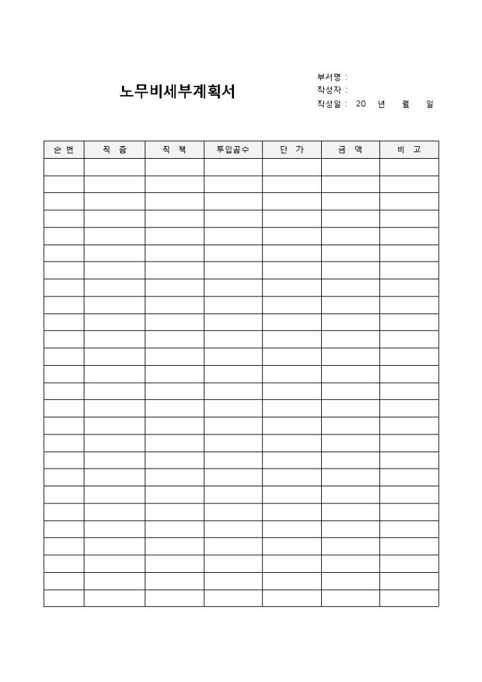 9,000원/월노무계획서입니다. 직종, 직책, 투입공수, 단가, 금액 등의 항목으로 구성되어 있습니다. 회사에서 노무비 사용에 대한 계획을 세부적으로 세울 경우 사용할 수 있는 계획서 양식입니다.