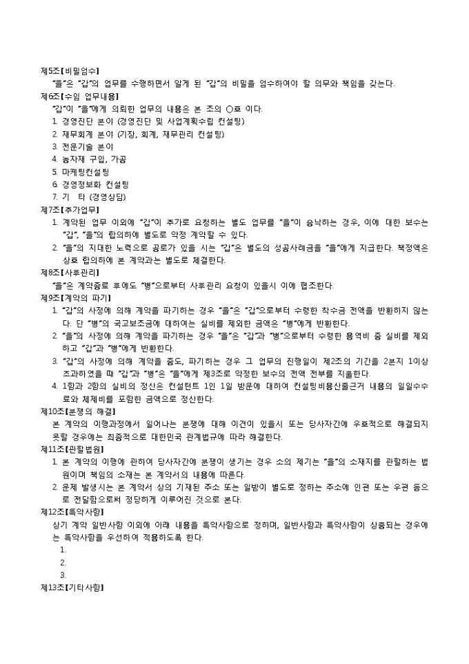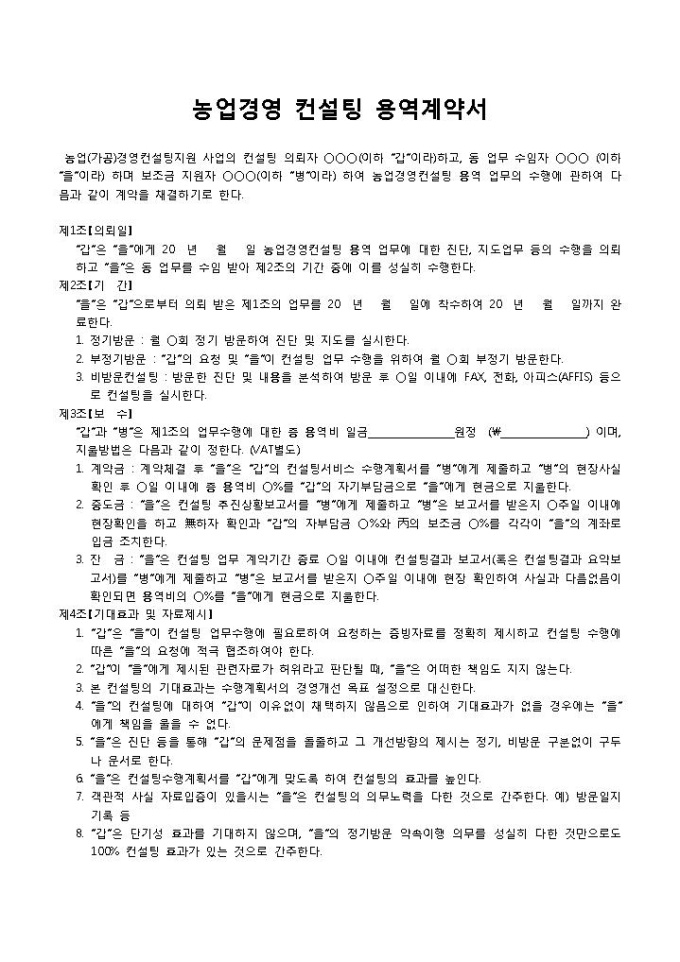 9,000원/월농업경영 컨설팅 용역계약서입니다. 컨설팅 용역 계약 내용으로 구성되어 있습니다. 컨설팅 의뢰자와 업무 수임자, 보조금 지원자는 농업경영컨설팅 용역 업무와 수행에 관한 계약을 체결할 때 작성하여 사용할 수 있습니다.