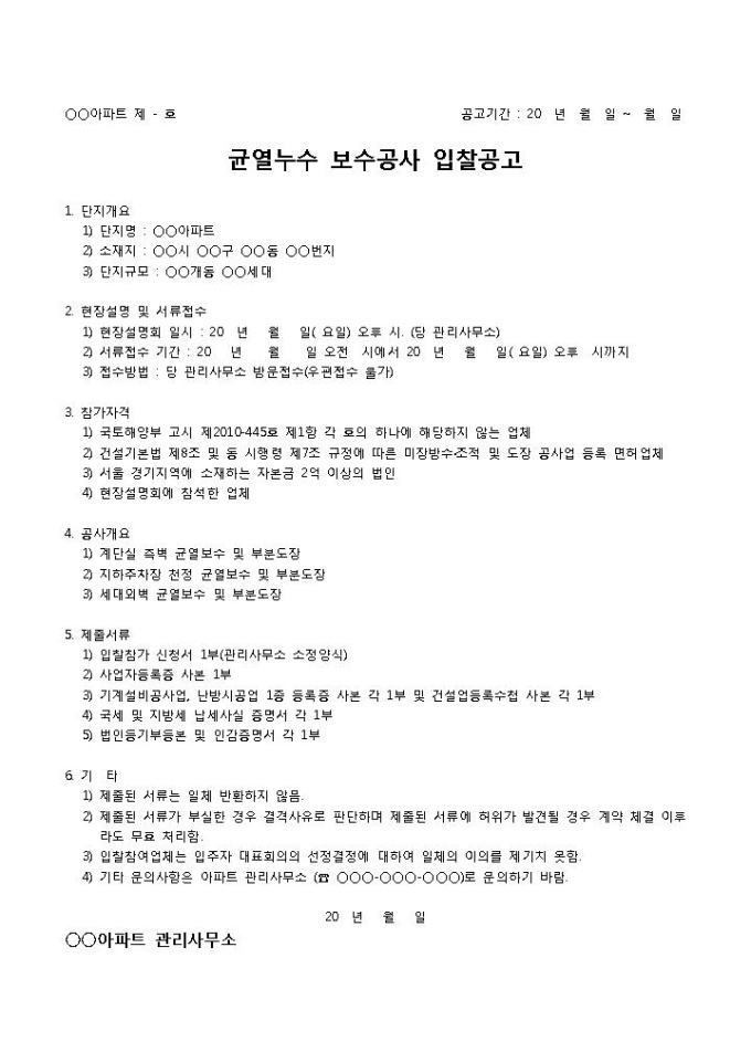 9,000원/월누수보수공사입찰공고입니다. 단지개요, 현장설명 및 서류접수, 참가자격, 공사개요 등의 항목으로 구성되어 있습니다. 아파트에서 균열누수 보수공사에 대한 입찰 공고 시 기본적으로 사용할 수 있는 양식입니다.