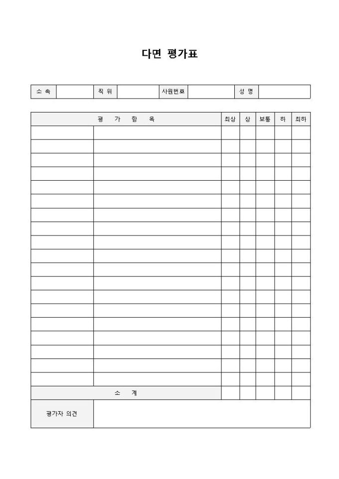 9,000원/월다면평가표(간단양식)입니다. 소속, 직위, 사원번호, 성명, 평가항목 등의 항목으로 구성되어 있습니다. 회사에서 평가항목을 직접 작성하여 간단하게 평가할 경우 사용할 수 있는 양식입니다.