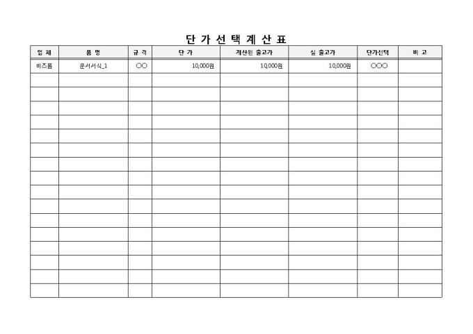 9,000원/월품명, 규격, 출고가 등의 항목으로 구성된 단가 계산 시에 사용하는 간단한 단가계산서 양식입니다.