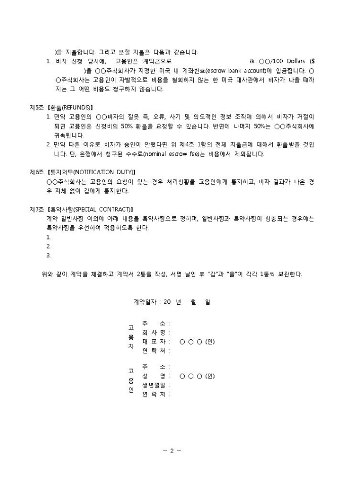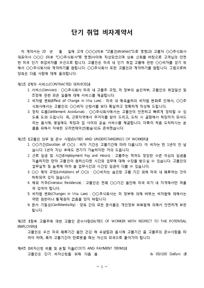 9,000원/월단기계약서입니다. 계약서비스, 고용인 의무 및 준수사항 등의 항목으로 구성되어 있습니다. 미국 단기 취업비자 발급 시 고용인과 고용자 간에 맺을 수 있는 기본적인 계약서 양식입니다.