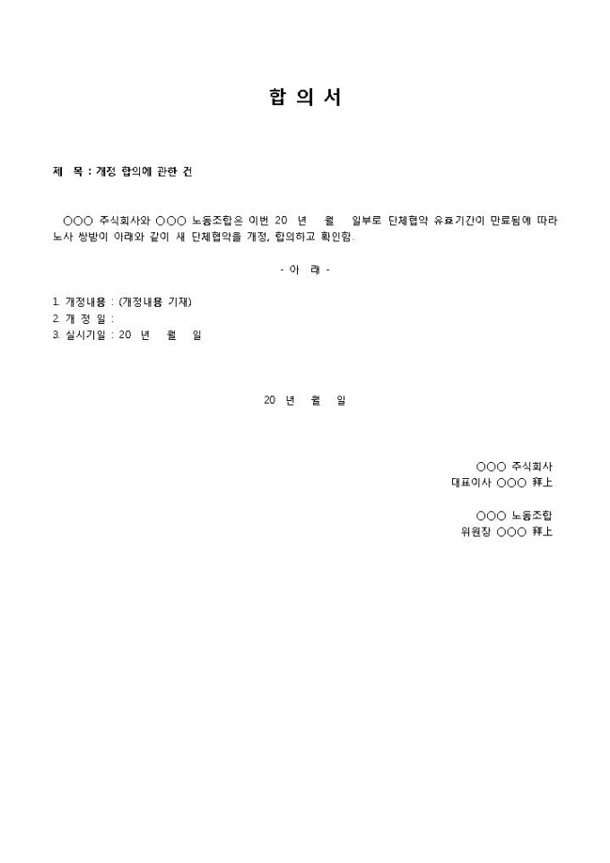 9,000원/월단체협약합의서입니다. 사측과 노사 측이 단체협약의 유효기간 만료로 인해 새 협약을 개정하고 합의한다는 내용의 합의서 양식입니다.