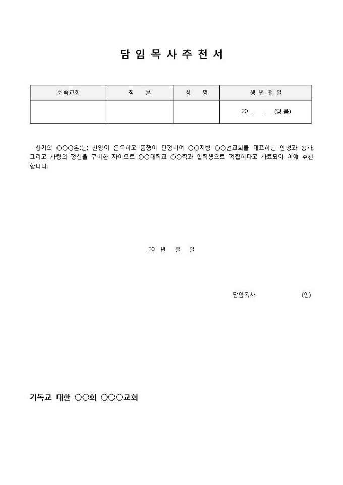 9,000원/월담임목사추천서(대학입학)입니다. 소속교회, 직분, 성명, 생년월일 등의 항목으로 구성되어 있습니다. 교회에서 대학 입학시 사용할 수 있는 담임 목사 추천서 양식입니다.