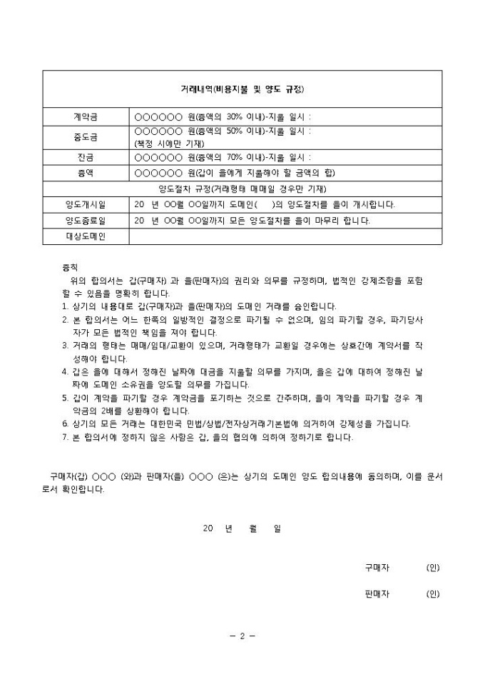 9,000원/월도메인소유권이전합의서입니다. 도메인 거래내역, 비용지불 및 양도규정 등의 항목으로 구성되어 있습니다. 도메인의 양도에 대해 합의 할 경우 사용할 수 있는 합의서 양식입니다.