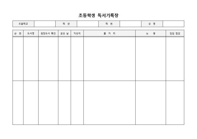 9,000원/월초등학생용 독서기록장 입니다. 순번, 도서명, 권장도서확인, 읽은날, 지은이 등으로 구성되었으며, 줄거리를 기록하고 그에 따른 논평 및 담임교사의 점검이 가능한 양식입니다.