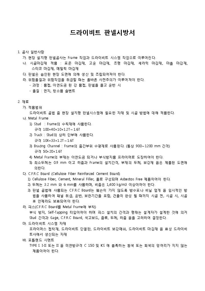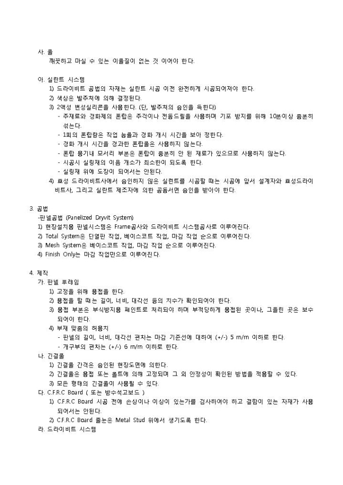 9,000원/월드라이비트시방서입니다. 공사 일반사항, 재료 등의 항목으로 구성되어 있습니다. 공사현장에서 드라이비트 판넬 공사에 대한 시방서 작성시 사용할 수 있는 간단한 양식입니다.