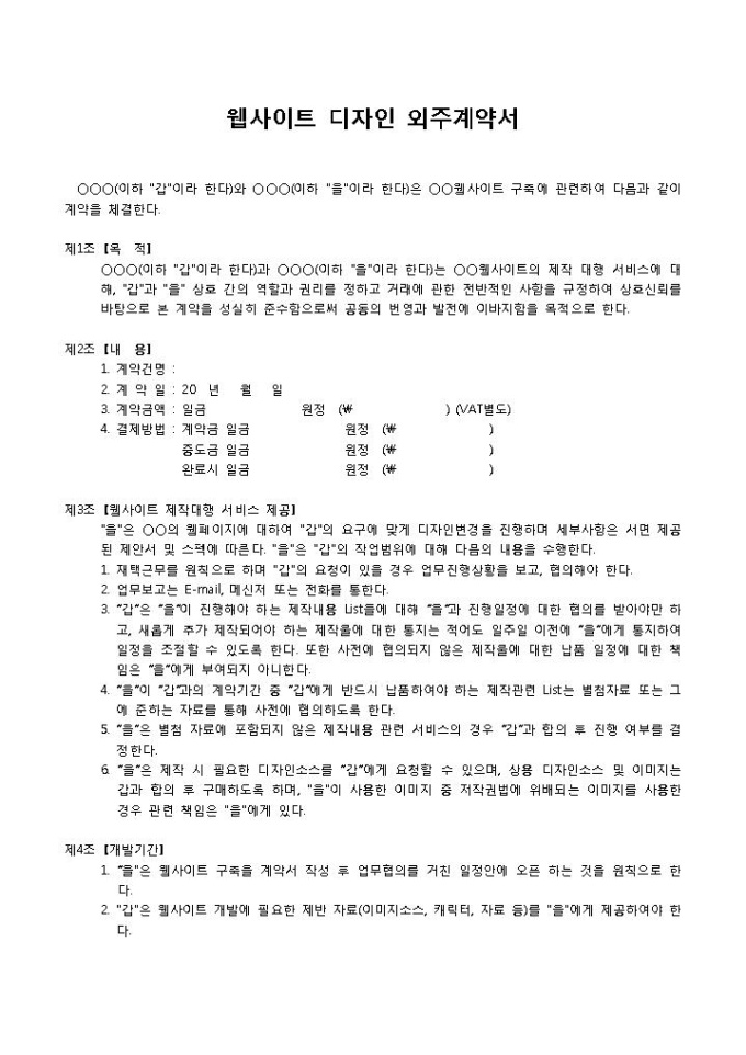 9,000원/월디자인계약서(웹사이트)입니다. 목적, 내용, 웹사이트 제작대행 서비스 제공 등의 항목으로 구성되어 있습니다. 총 17조항으로 구성되어 있으며 웹사이트 디자인 외주 계약시 사용할 수 있는 계약서 양식입니다.