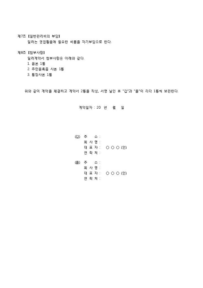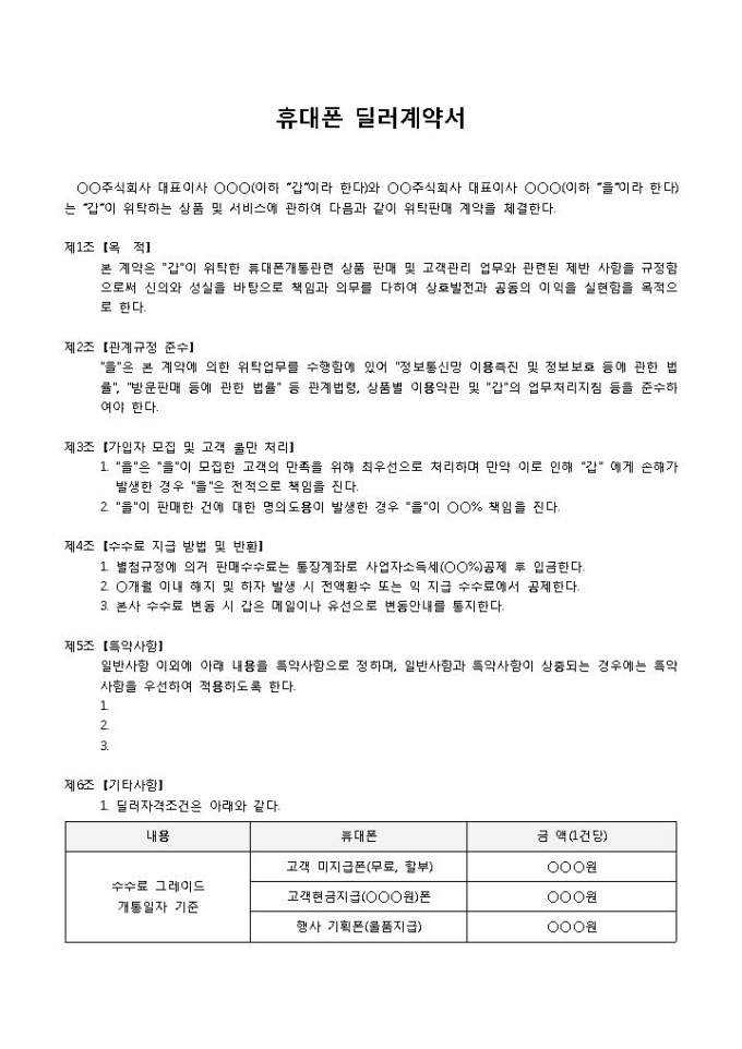 9,000원/월딜러계약서입니다. 목적, 관계규정준수, 가입자 모집 및 고객 불만처리 등의 항목으로 구성되어 있습니다. 총 8조항으로 구성되어 있으며 휴대폰 딜러 계약시 회사간에 사용할 수 있는 계약서 양식입니다.