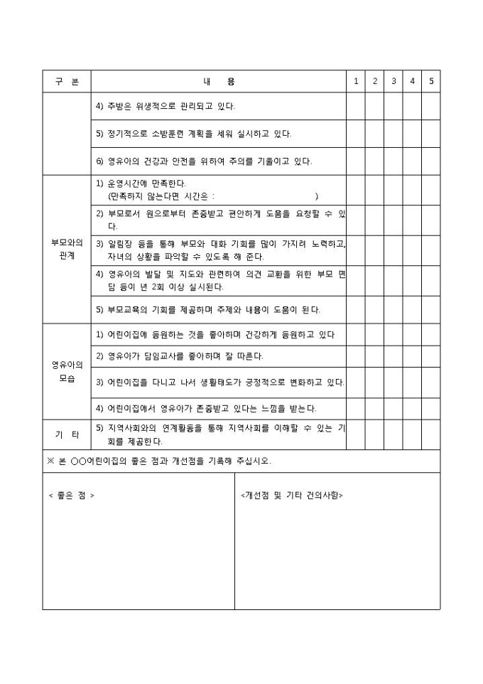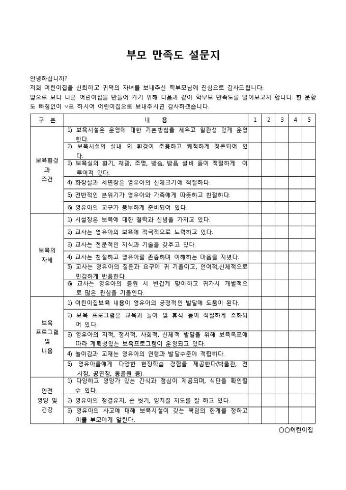 9,000원/월만족도설문지(부모)입니다. 구분, 내용, 평가 등의 항목으로 구성되어 있습니다. 어린이집에서 학부모들에게 어린이집에 대한 만족도 조사를 할 경우 사용할 수 있는 양식입니다.