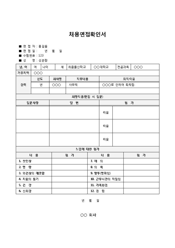 9,000원/월면접자가 해당 기업에서 면접에 응시했다는 사실을 증명할 때 사용되는 면접확인서(채용) 양식입니다. 면접자, 면접일, 수험번호, 성명, 경력, 희망직종, 느낌에 대한 평가 등의 항목으로 구성되어 있습니다.
