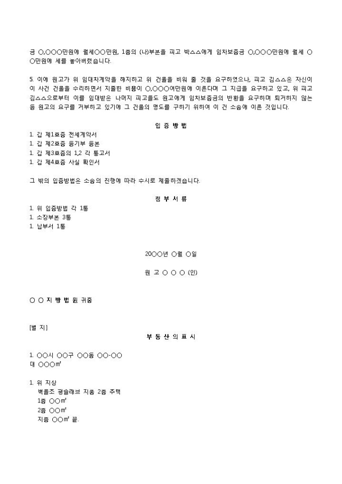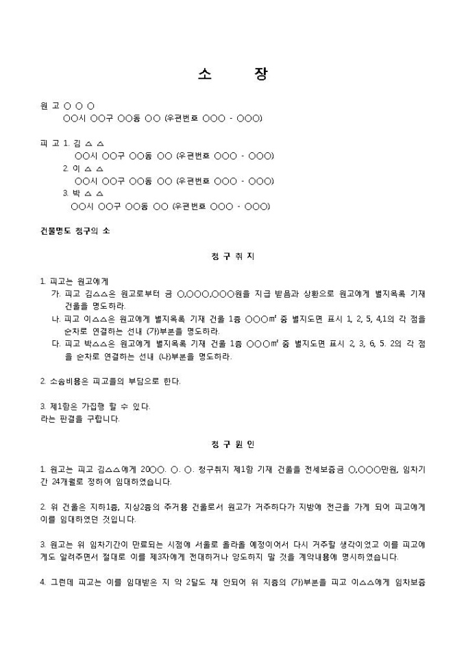 9,000원/월명도소장입니다. 원고, 피고1, 2, 3의 인적사항 등의 항목으로 구성되어 있습니다. 원고의 주택을 무단으로 임대, 개조한 건에 대한 건물 명도 소장 양식입니다.