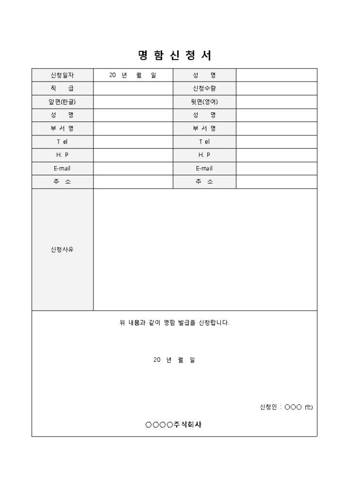 9,000원/월명함신청서 입니다. 신청일자, 성명, 직급, 부서명, TEL, H.P 등으로 구성되었습니다. 신청 사유를 명확히 기재할 수 있습니다.