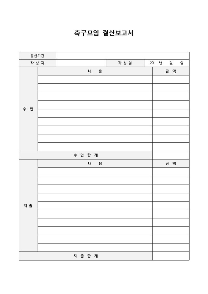 9,000원/월모임결산보고서입니다. 결산기간, 작성자, 작성일, 수입, 내용, 금액, 지출 등의 항목으로 구성되어 있습니다. 축구 모임에서 수입, 지출 내역에 대한 결산보고서를 간단하게 작성할 경우 사용할 수 있는 양식입니다.