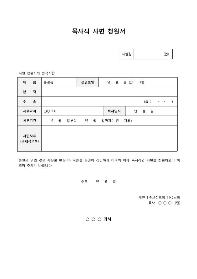 9,000원/월목사직의 사면을 청원할 때 사용되는 목사직 사면 청원서 양식입니다. 시찰장의 확인란, 사면 청원자의 이름, 생년월일, 본적, 주소, 시무교회, 시무기간, 목사임직, 사면이유 등의 항목으로 구성되어 있습니다.