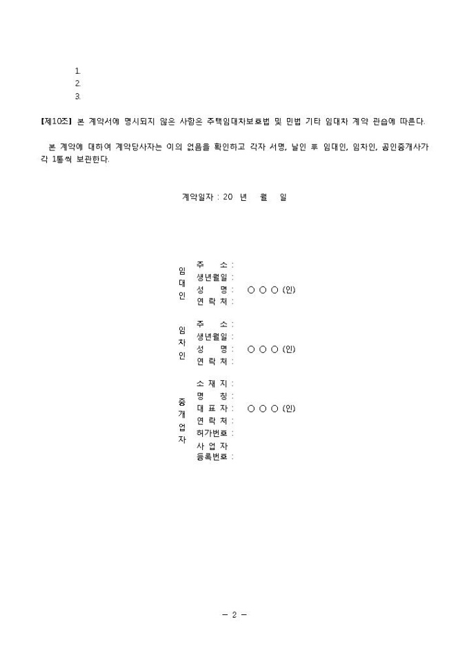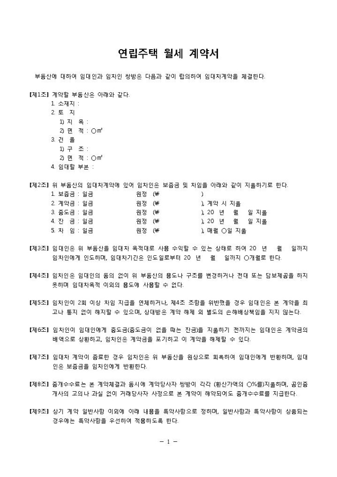 9,000원/월월세계약서(연립주택)입니다. 총 10조항으로 구성되어 있으며 임대인과 임차인, 중개업자 간에 연립주택 월세 계약시 사용할 수 있는 양식입니다.