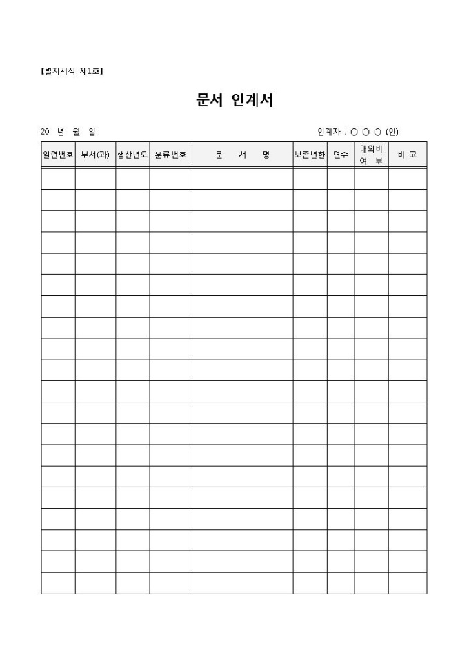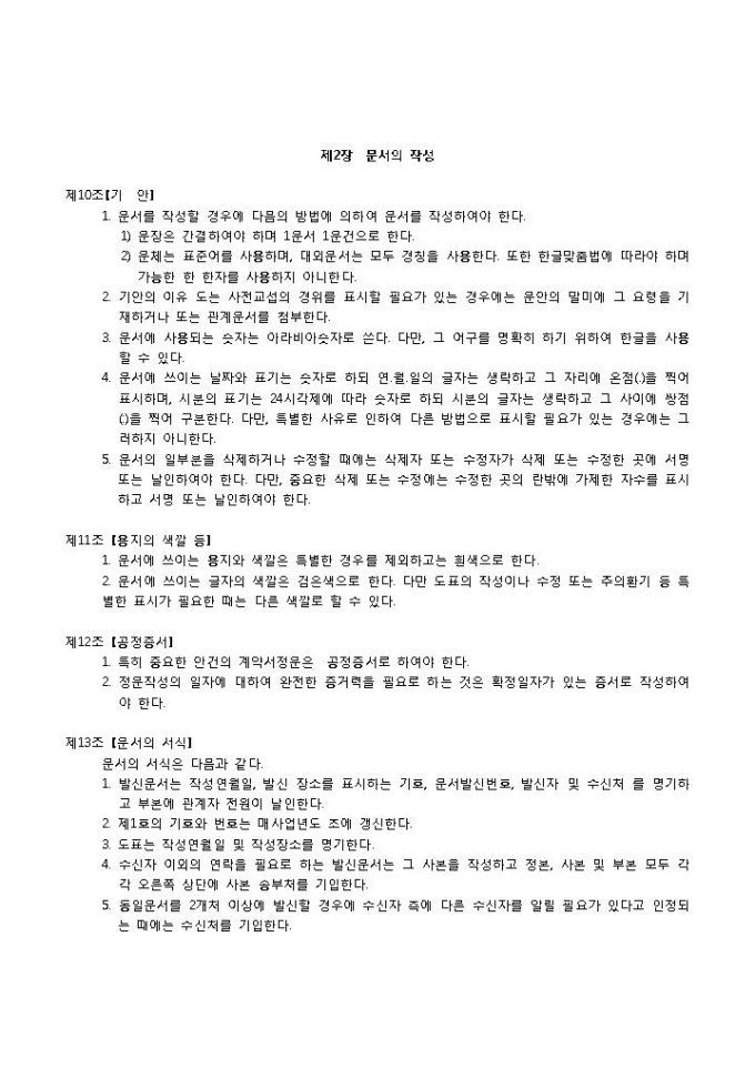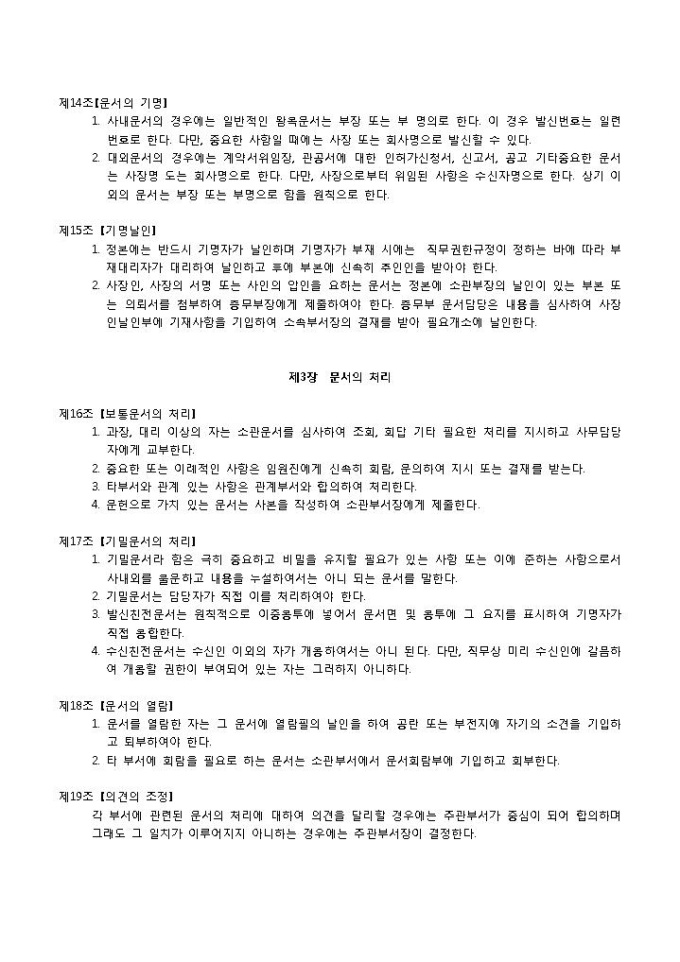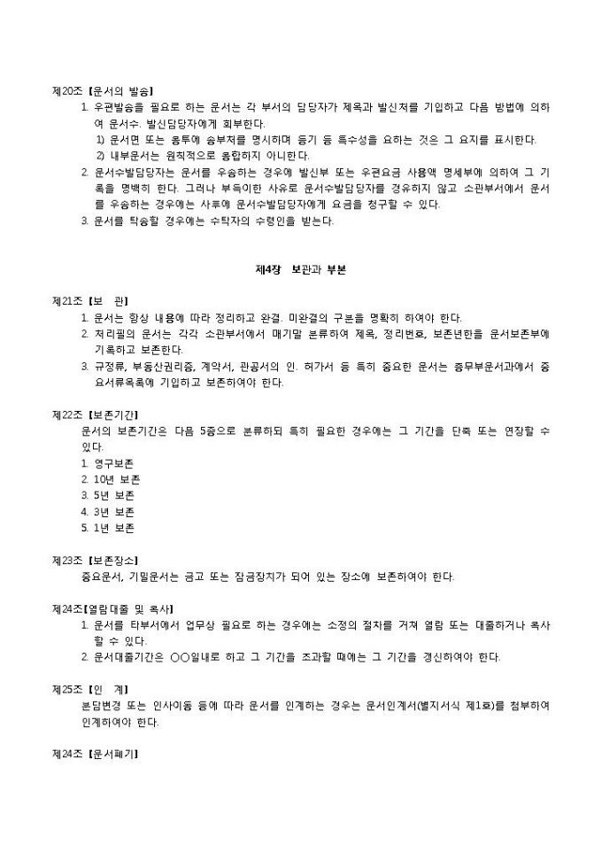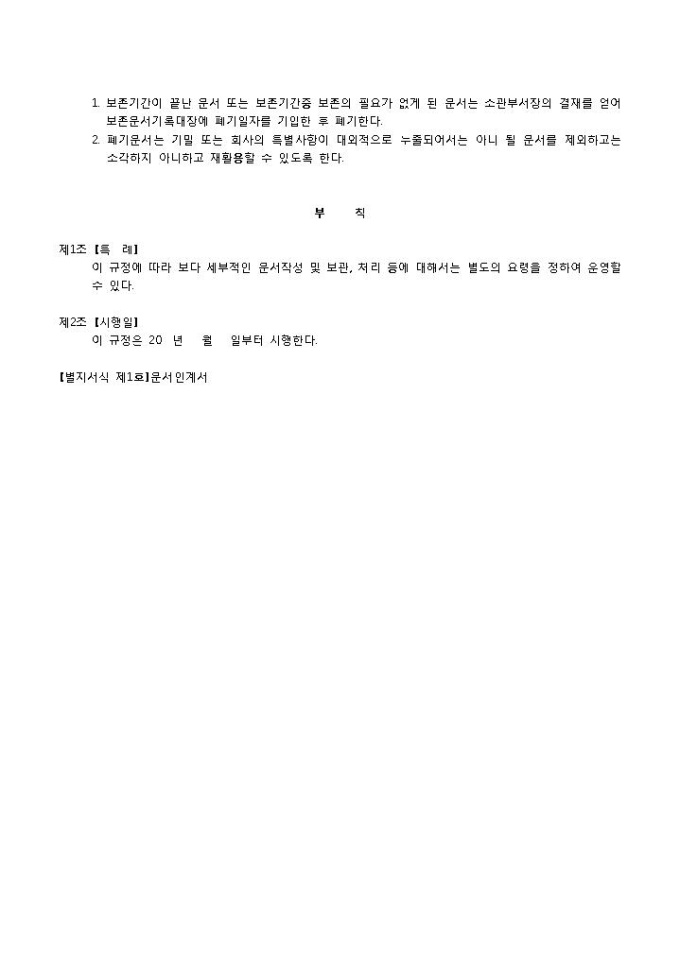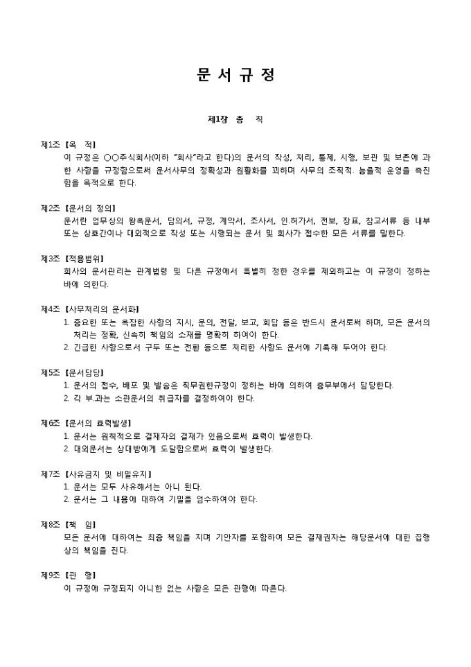 9,000원/월문서규정입니다. 목적, 문서의 정의, 적용범위, 사무처리의 문서, 문서담당 등의 항목으로 구성되어 있습니다. 부칙을 포함하여 총 5장 26조항으로 구성되어 있으며 회사에서 문서 관리에 대한 규정을 정할 경우 사용할 수 있는 양식입니다. 별지 서식으로 문서인계서가 포함되어 있습니다.