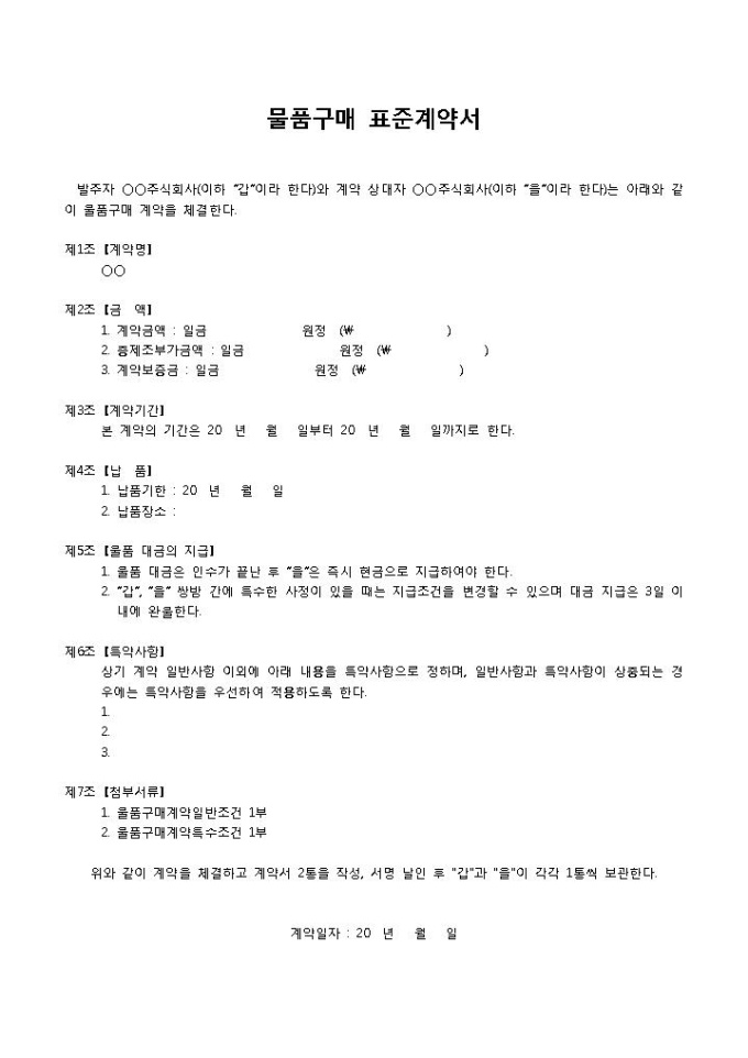 9,000원/월물품구매표준계약서(토지)입니다. 계약명, 금액, 계약기간, 납품 등의 항목으로 구성되어 있습니다. 총 7조항으로 구성되어 있으며 발주자와 계약 상대자 간에 토지 물품구매 시 사용할 수 있는 양식입니다.