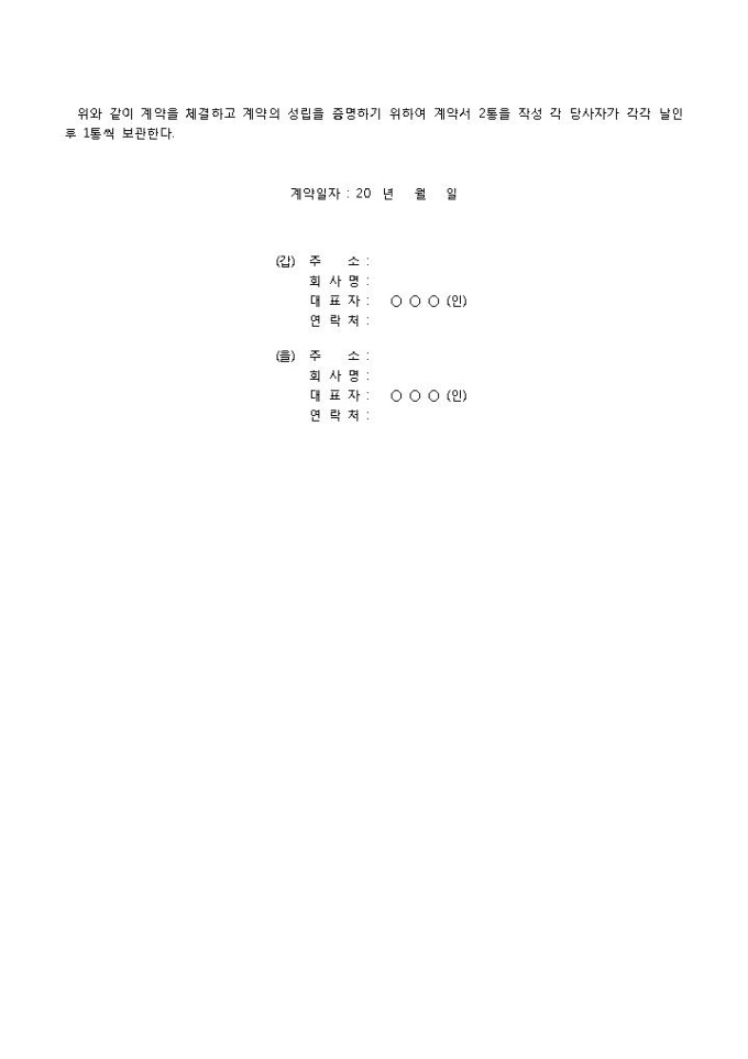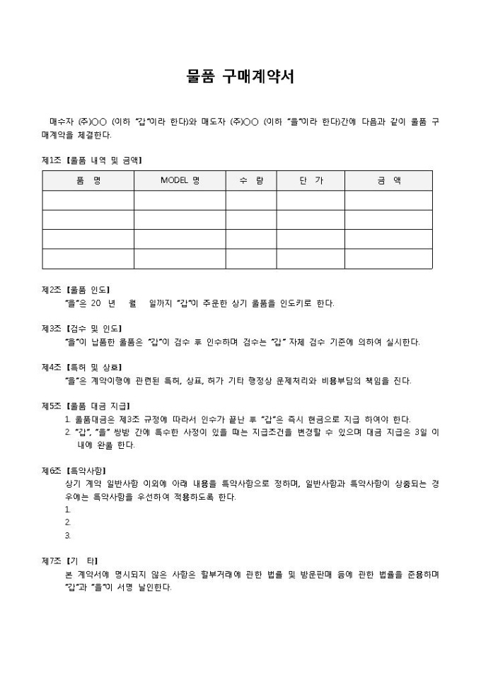 9,000원/월물품구입계약서입니다. 물품내역 및 금액, 물품 인도, 검수 및 인도, 특허 및 상호 등의 항목으로 구성되어 있습니다. 총 7조항으로 구성되어 있으며 회사 간에 물품 구매에 대한 계약서 작성 시 사용할 수 있는 양식입니다.