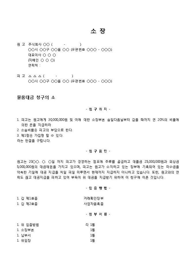 9,000원/월물품대금청구소장(주류)입니다. 원고의 인적사항, 피고의 인적사항 등의 항목으로 구성되어 있습니다. 원고가 피고의 점포에 주류를 공급에 대한 대금채권을 받지 못하여 대금을 지급받기 위해 소장을 제출하는 내용의 소장 양식입니다.