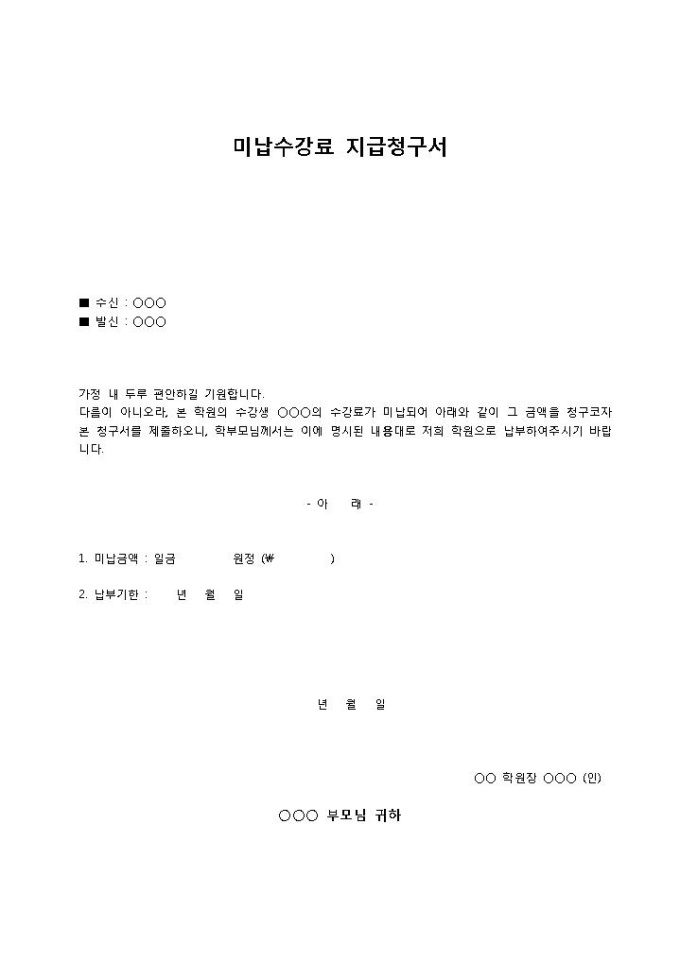 9,000원/월학원의 수강료를 미납하였을 때 수강생 측 학부모께 보낼 때 쓰이는 미납수강료 지급청구서 양식입니다. 수신, 발신, 미납금액, 납부기한 등의 항목으로 구성되어 있습니다.