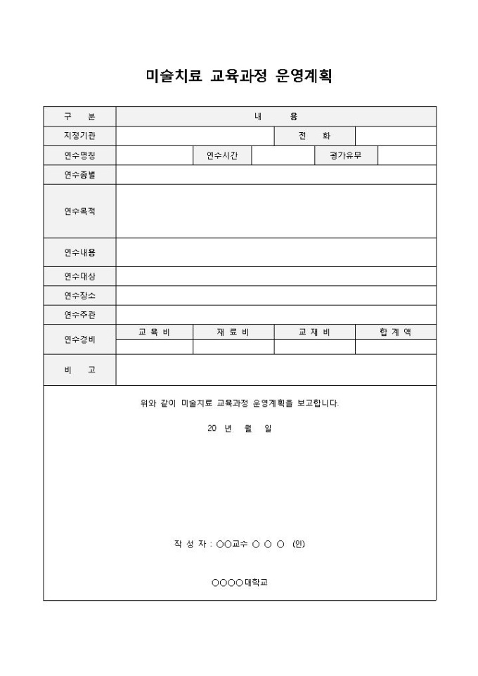 9,000원/월미술교육학계획서입니다. 지정기관, 연수명칭, 연수종별, 연수목적, 연수내용, 연수대상, 연수장소 등의 항목으로 구성되어 있습니다. 미술치료 교육과정 연수 시 연수 계획에 대하여 작성할 수 있는 양식입니다.