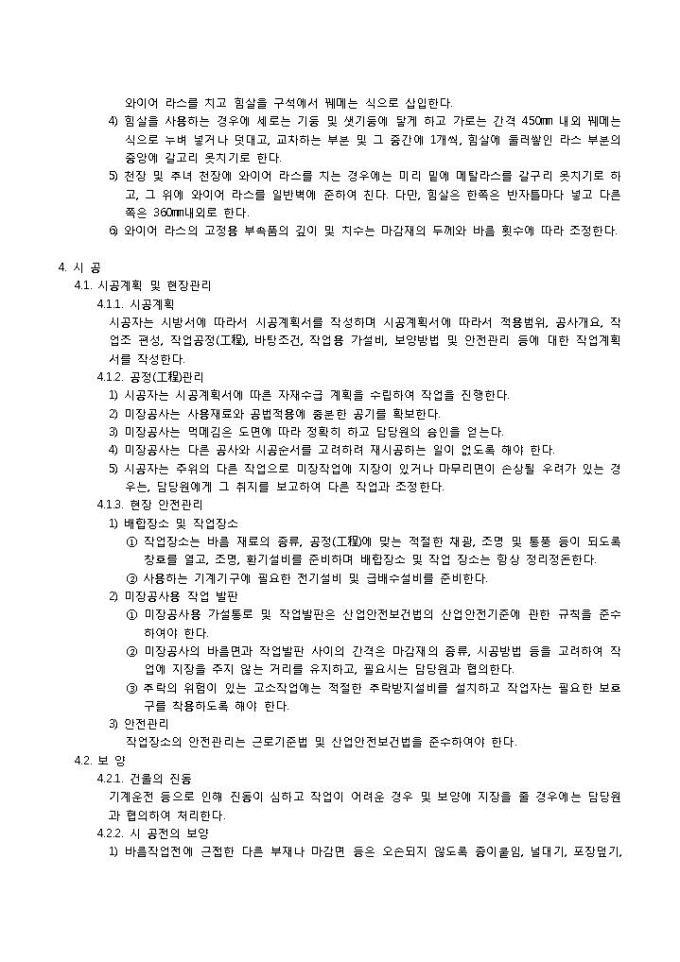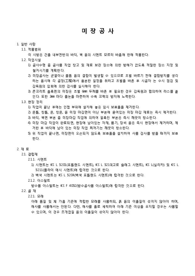 9,000원/월미장시방서입니다. 일반사항, 적용범위, 작업시설, 현장정리 등의 항목으로 구성되어 있습니다. 건물 미장 공사 시 사용할 수 있는 시방서 양식입니다.