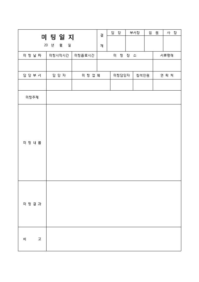 9,000원/월미팅일지(상세)입니다. 미팅날짜, 미팅시작시간, 종료시간, 장소 등의 항목으로 구성되어 있습니다. 미팅의 정보를 상세히 기록하고 미팅내용을 기록할 수 있는 일지 양식입니다.
