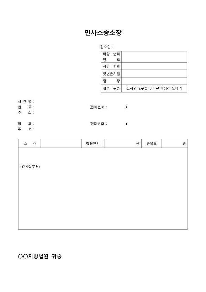 9,000원/월민사소송소장입니다. 접수인, 사건명, 원고, 주소, 피고, 주소, 소가, 첩용인지 등의 항목으로 구성되어 있습니다. 민사소송 소장 작성 시 기본적으로 사용할 수 있는 소장 양식입니다.