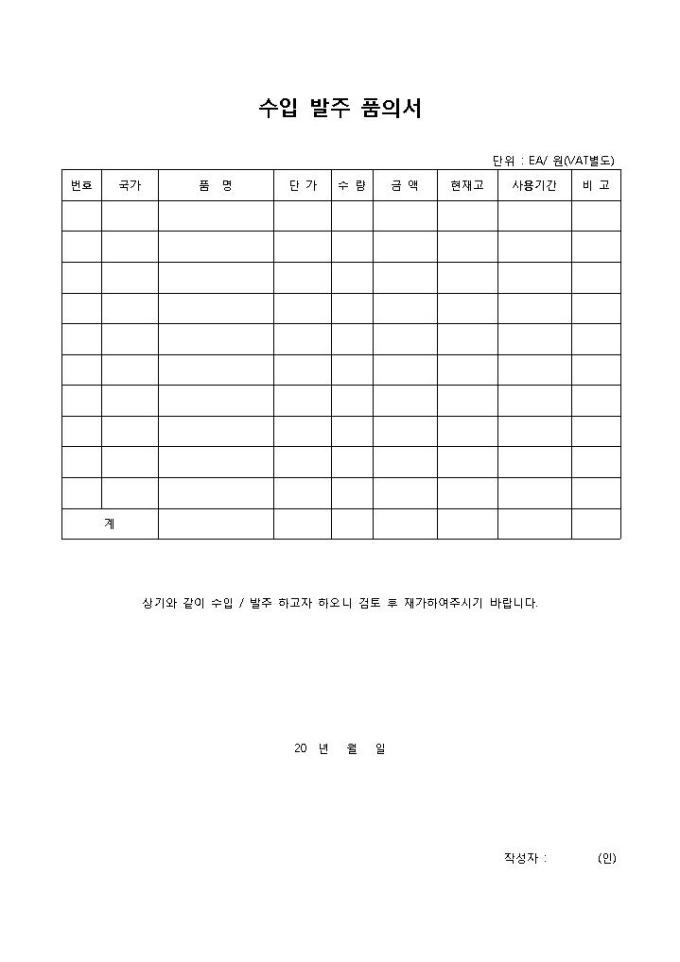 9,000원/월발주품의서(수입)입니다. 번호, 국가, 품명, 단가, 수량 등의 항목으로 구성되어 있습니다. 수입제품에 대해 발주 시 사용할 수 있는 품의서 양식입니다.