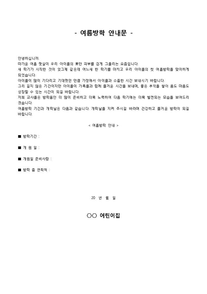 9,000원/월방학안내문입니다. 방학기간, 개원일, 개원일 준비사항 등의 항목으로 구성되어 있습니다. 어린이집에서 학부모에게 여름 방학에 대해 안내할 경우 사용할 수 있는 양식입니다.