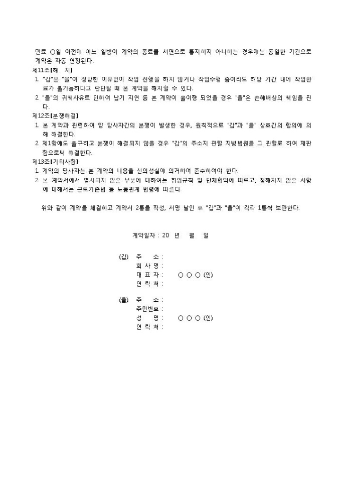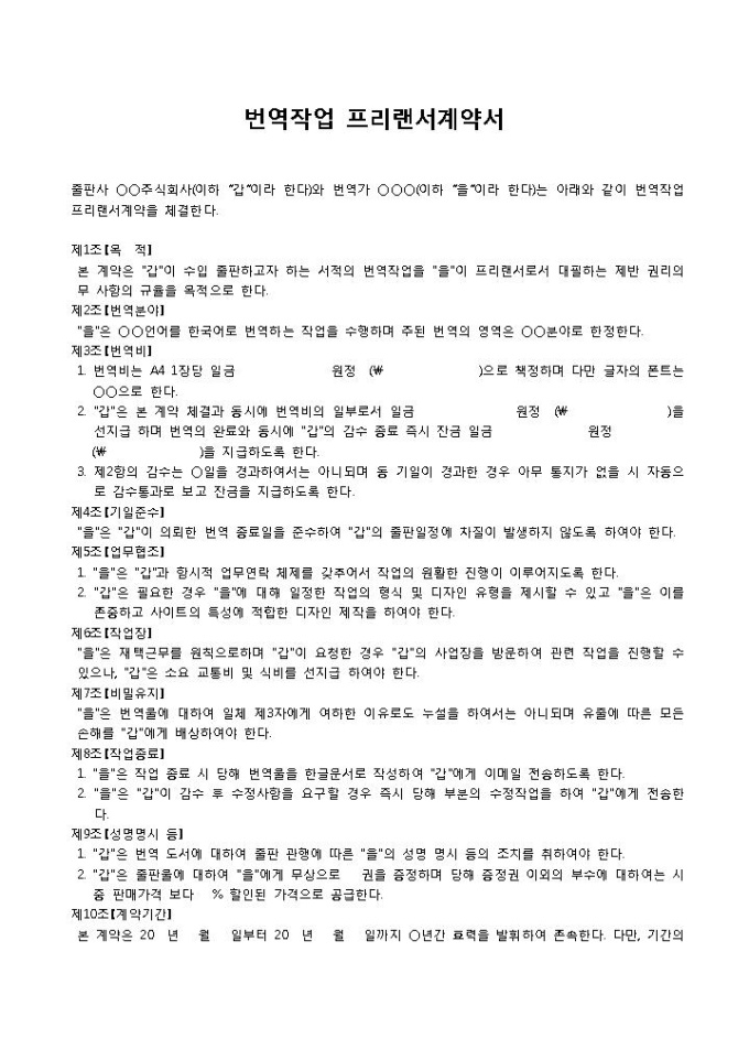 9,000원/월번역작업을 하는 프리랜서 계약을 위해 쓰이는 번역작업 프리랜서 계약서입니다. 여러 조항들과 서로간의 확인란으로 구성되어 있습니다.