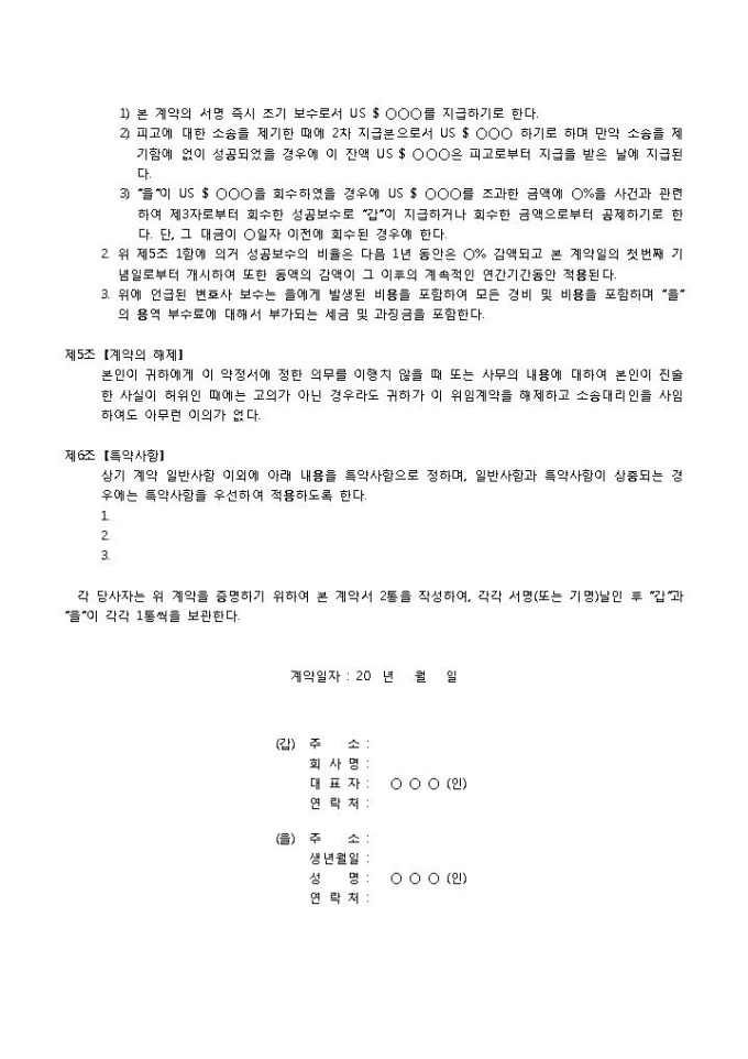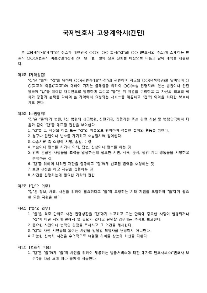 변호사선임계약서(국제변호사)입니다. 계약성립, 수권행위, 갑의 의무 등의 항목으로 구성되어 있습니다. 총 6조항으로 구성되어 있으며 국제변호사 고용 계약시 회사와 변호사 간에 작성하여 사용할 수 있는 양식입니다.