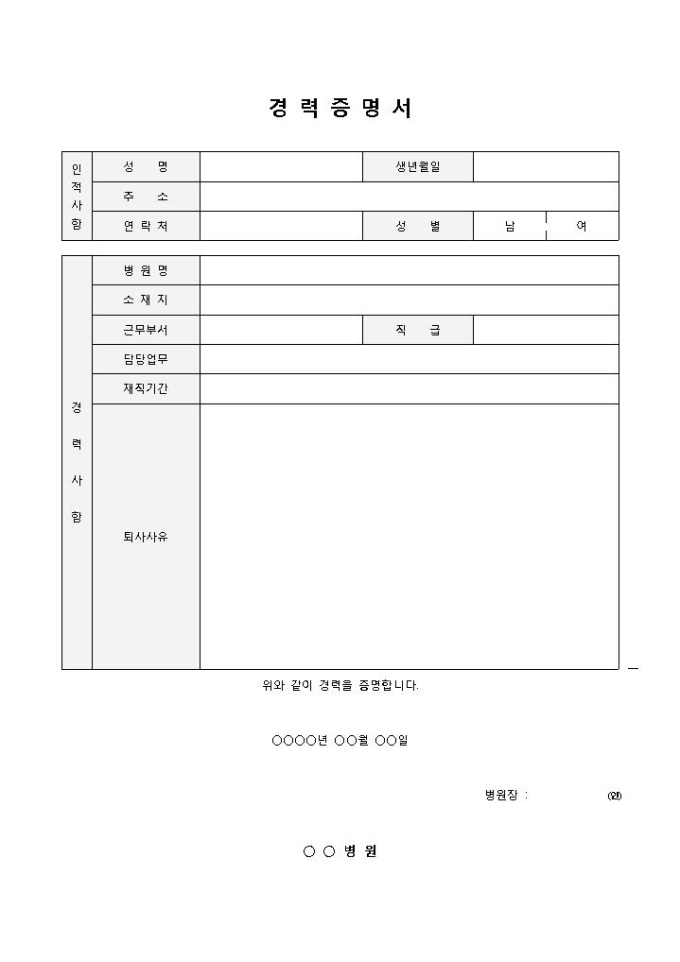 9,000원/월병원경력증명서 입니다. 인적사항, 경력사항 등으로 구성되었으며, 경력사항을 보다 상세히 작성할 수 있습니다.