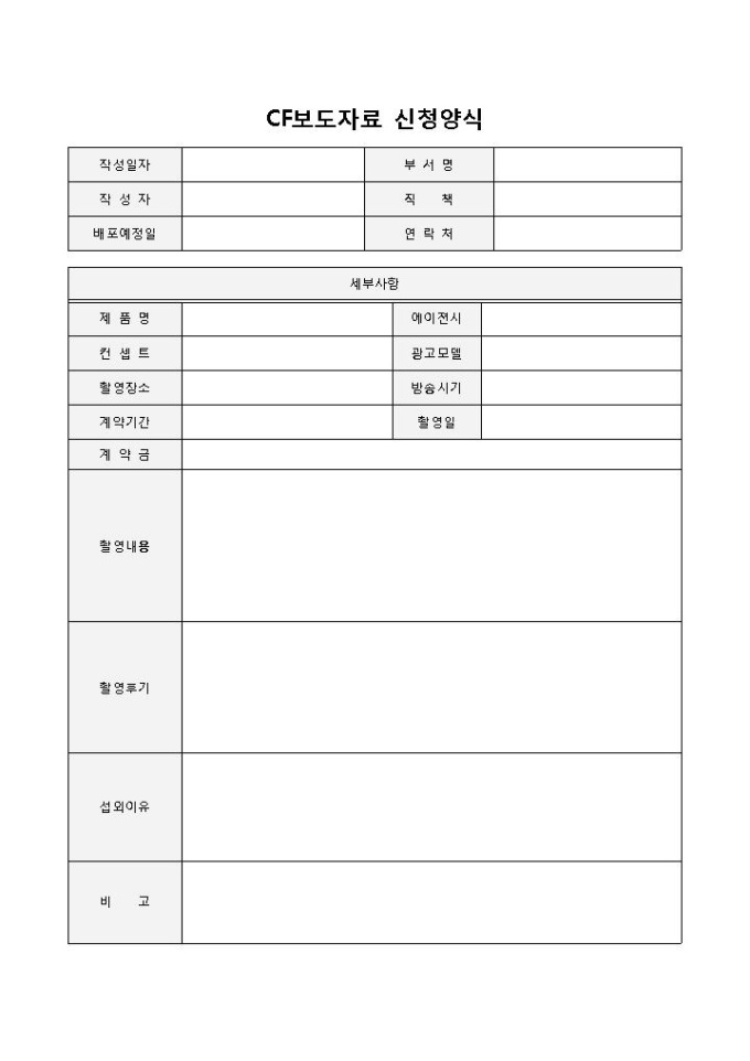 9,000원/월cf보도자료서식 입니다. 작성일자, 부서명, 직책, 작성자, 배포예정일, 연락처 등으로 구성되었습니다. 촬영내용 및 후기 등 업무시 발생한 사항에 대하여 구체적으로 기록할 수 있습니다.