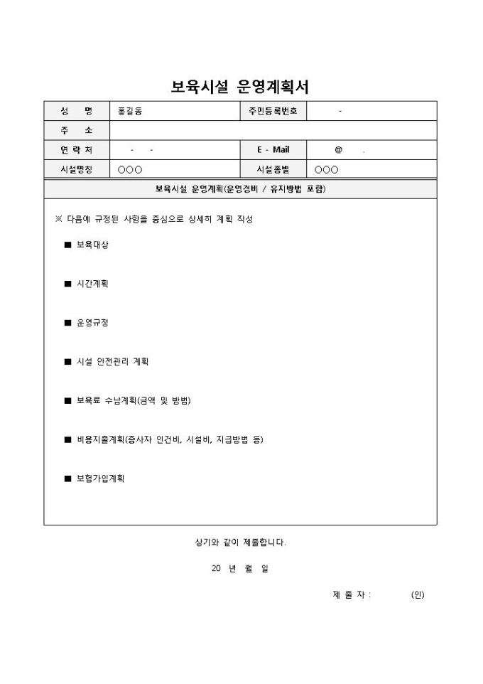 9,000원/월보육시설의 운영을 계획할 때 쓰이는 보육시설 운영계획서 양식입니다. 관리자의 인적사항, 보육시설 운영계획 내용 등의 항목으로 구성되어 있습니다.