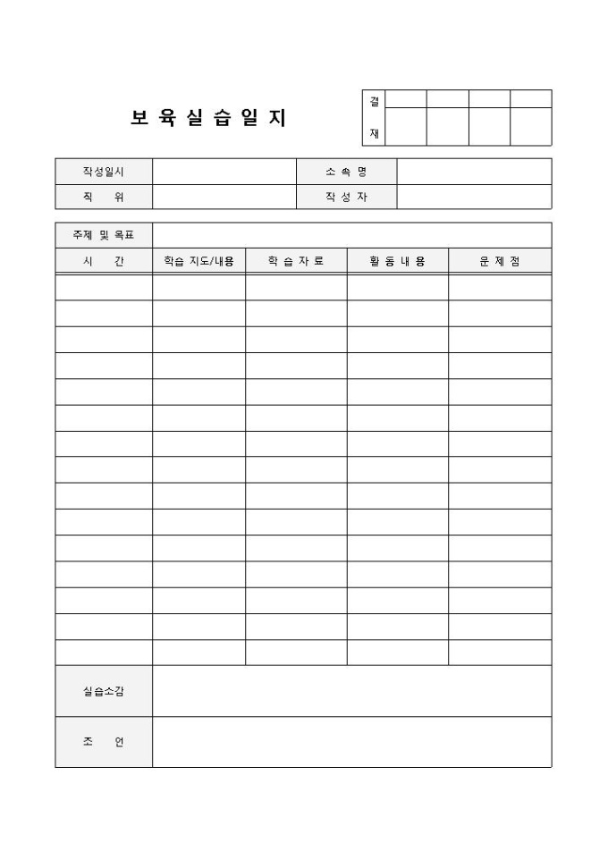 9,000원/월보육실습일지 입니다. 작성일자, 소속명, 작성자, 직위, 주제 및 목표 등으로 구성되었습니다. 업무 수행 중 발생한 문제점 기록에 효과적이며, 조언을 통해 특이사항을 점검할 수 있습니다.