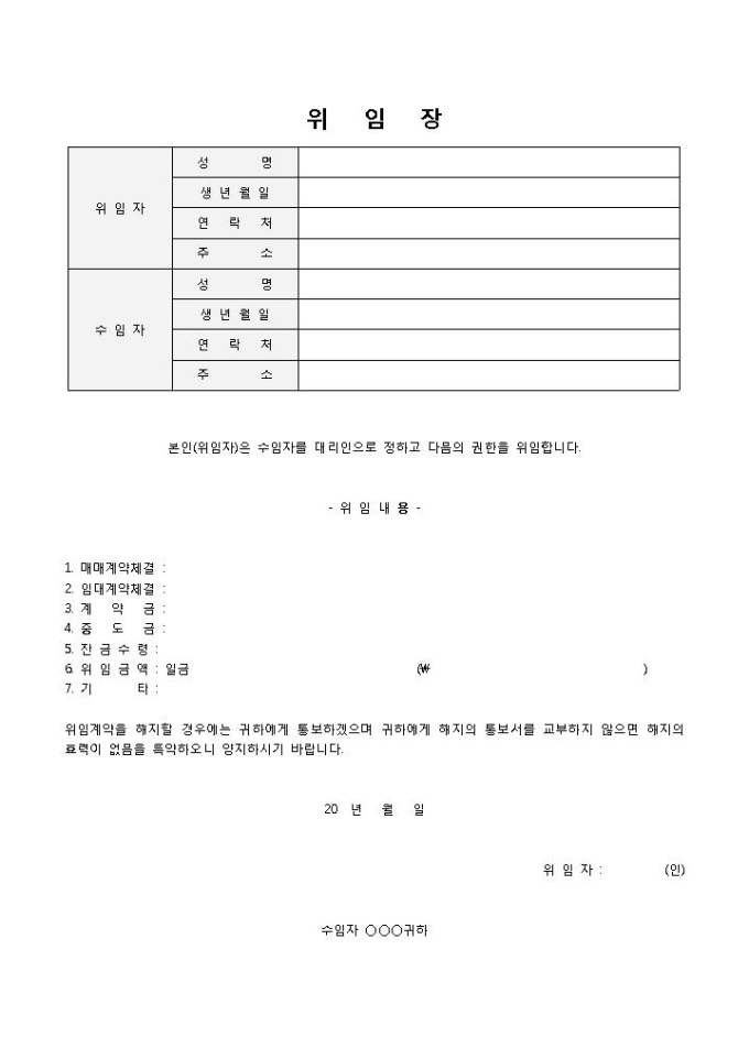 9,000원/월부동산계약위임장 입니다. 위임자 성명, 주민등록번호, 연락처, 주소 등으로 구성되었습니다. 위임내용을 구체적으로 기입할 수 있으며, 계약 해지시 발생하게 될 사항에 대하여 간략하게 기입되어 있습니다.