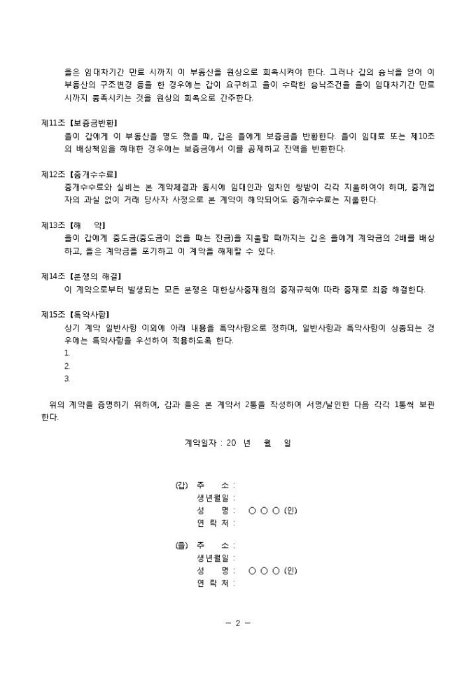 9,000원/월부동산전월세계약서입니다. 부동산의 표시, 보증금, 임대료, 인도일자, 임대차기간, 양도 및 전대 등의 항목으로 구성되어 있습니다. 총 15조항으로 구성되어 있으며 상황에 맞게 기입하여 사용할 수 있는 간단한 계약서 양식입니다.