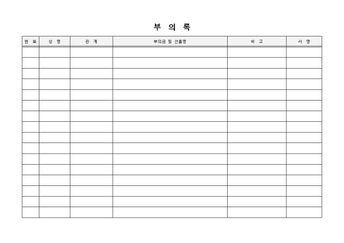 9,000원/월부의록 입니다. 번호, 성명, 관계, 부의금 및 선물명, 비고 등으로 구성되었습니다. 비고란을 통해 세부적인 내용 및 기타 사항등을 기록할 수 있습니다.