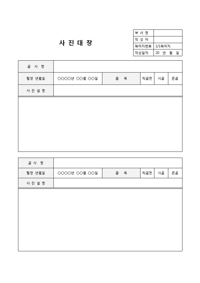 9,000원/월사진대장(공사)입니다. 공사명, 촬영년월일, 종목, 사진설명, 등으로 구성되었습니다. 보고내용 및 사진첨부에 용이합니다.