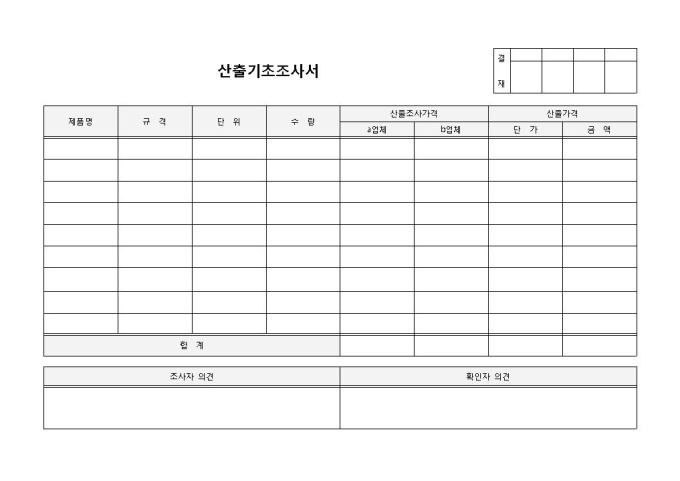9,000원/월산출기초조사서 입니다. 제품명, 규격, 단위, 수량, 산출조사가격, 합계 등으로 구성되었습니다. 조사자 및 확인자의 의견을 작성할 수 있습니다.