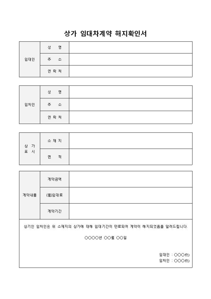 9,000원/월상가 임대차계약 해지확인서 입니다. 임대인, 임대차, 상가표시, 계약내용 등으로 구성되었습니다. 확인증 불출 및 관리에 용이합니다.
