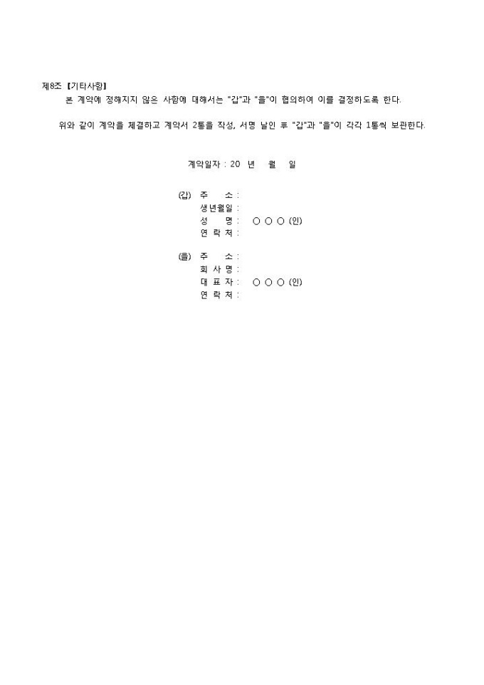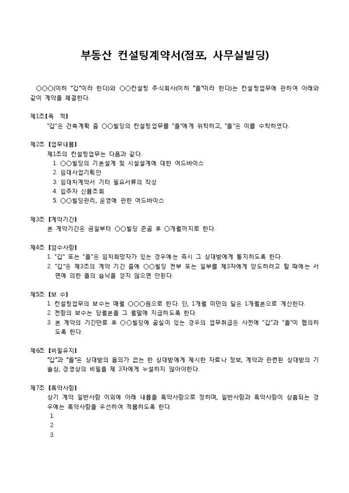 9,000원/월상가컨설팅계약서입니다. 목적, 업무내용, 계약기간, 엄수사항, 보수, 비밀유지, 특약사항 등의 항목으로 구성되어 있습니다. 총 8조항으로 구성되어 있으며 제 7조 특약사항을 포함하여 상황에 맞게 기입하여 사용할 수 있는 계약서 양식입니다. 점포와 사무실 빌딩에 대해 컨설팅 계약 시 사용할 수 있는 양식입니다.