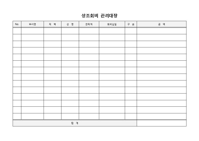 9,000원/월상조회비 관리대장 입니다. 부서명, 직책, 성명, 연락처, 회비납일, 금액 등으로 구성되었습니다. 각 부서별 납입인원 및 금액 관리에 용이합니다.